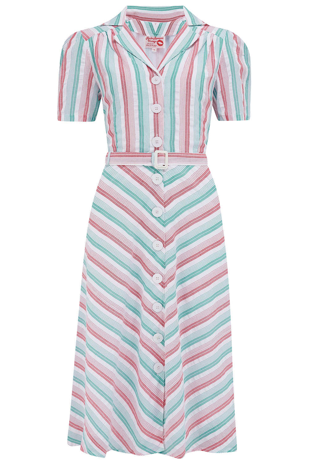 **Limited Edition** Charlene Shirtwaister Dress in Green & Red Stripe, 100% Cotton Seersucker, True 1950s Vintage Style