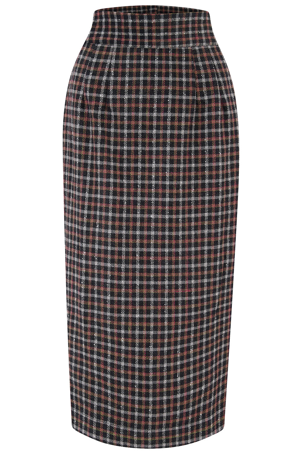 RnR "Luxe" Range "Jitterbug" Pencil Skirt with Kick-Pleat in Black & Red Small Check, 100% Wool, Iconic 1940s Vintage Style (Wool No.9)