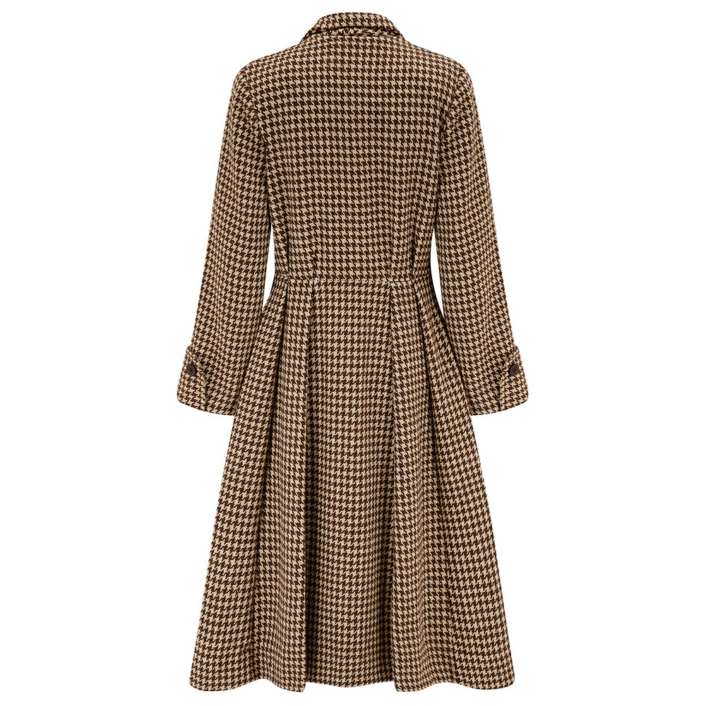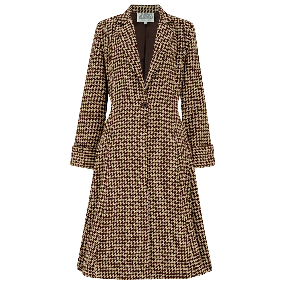The Elizabeth Coat in Brown Houndstooth, 100% Wool & Satin Lined. A Classic Fitted 1940s Styled Overcoat