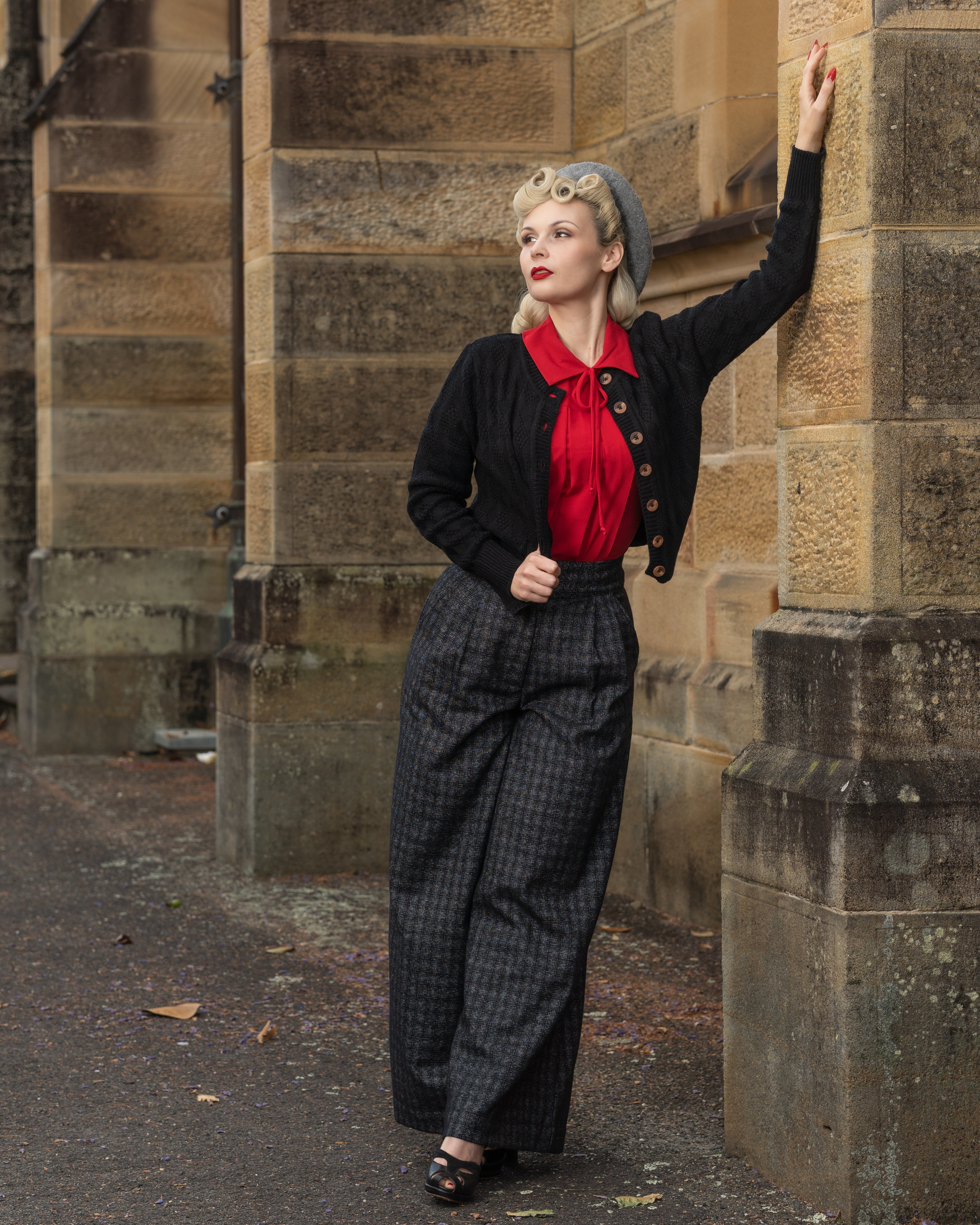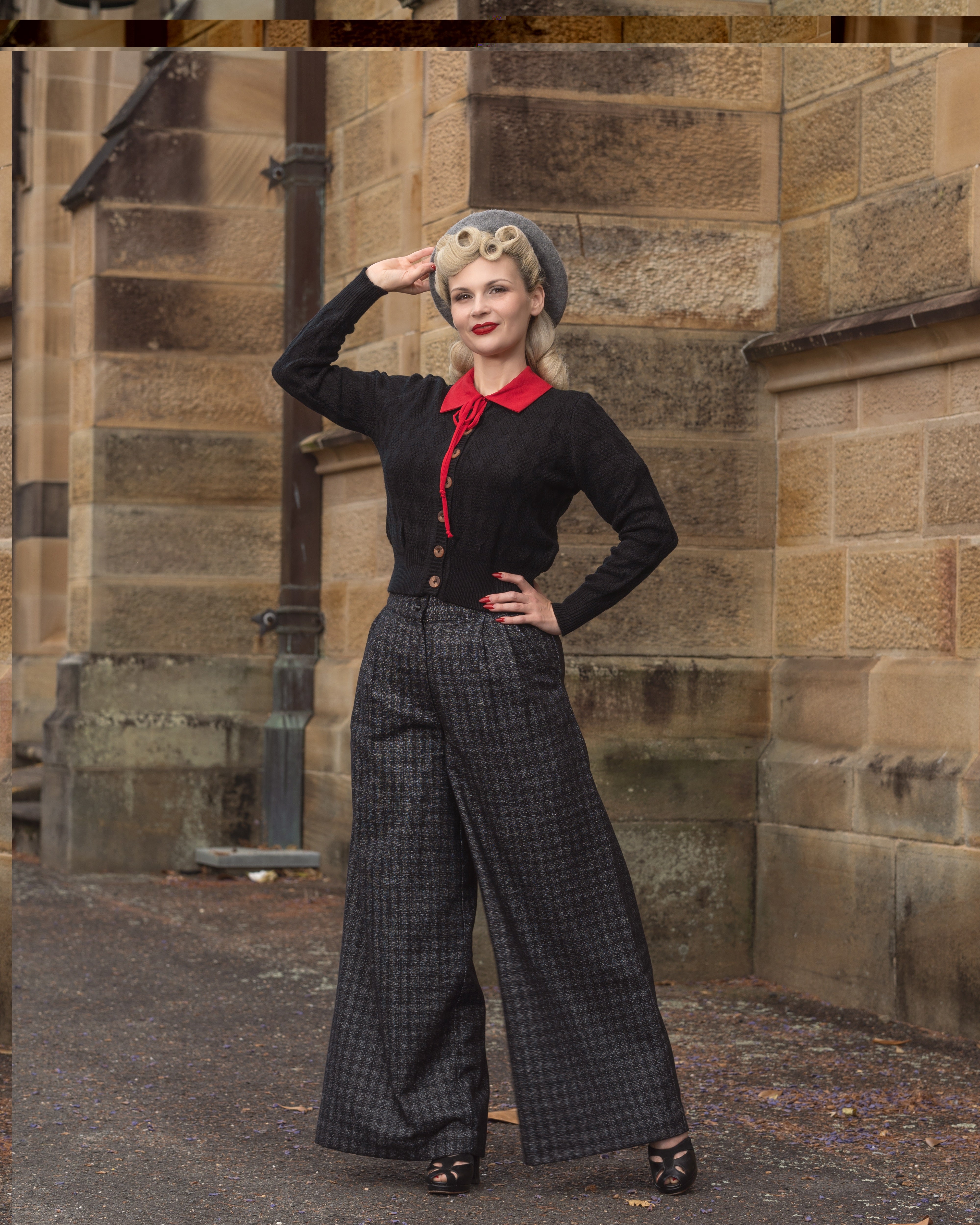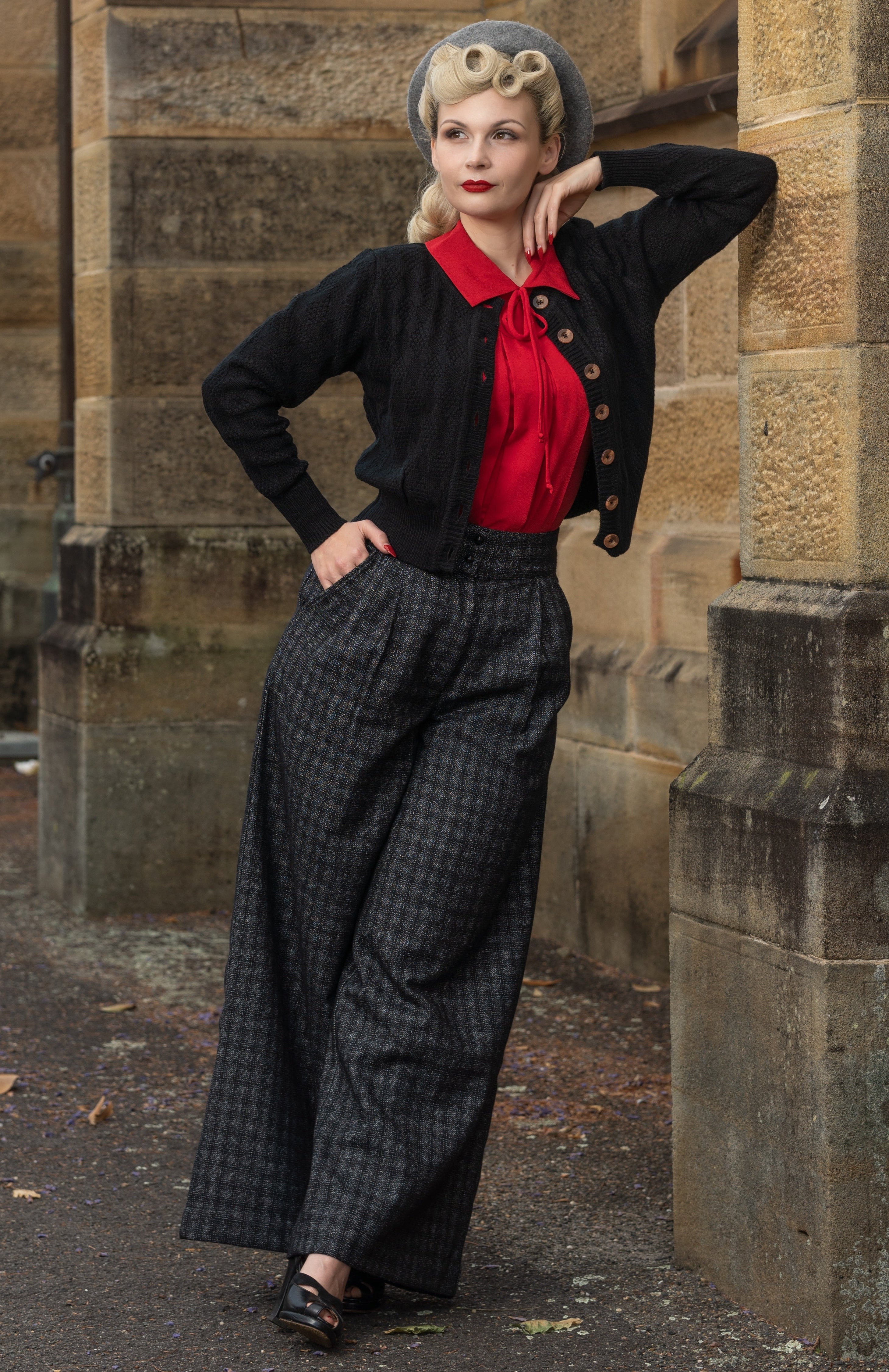 The "Sandra" Textured Diamond Knit Cardigan in Black, 1940s & 50s Vintage Style