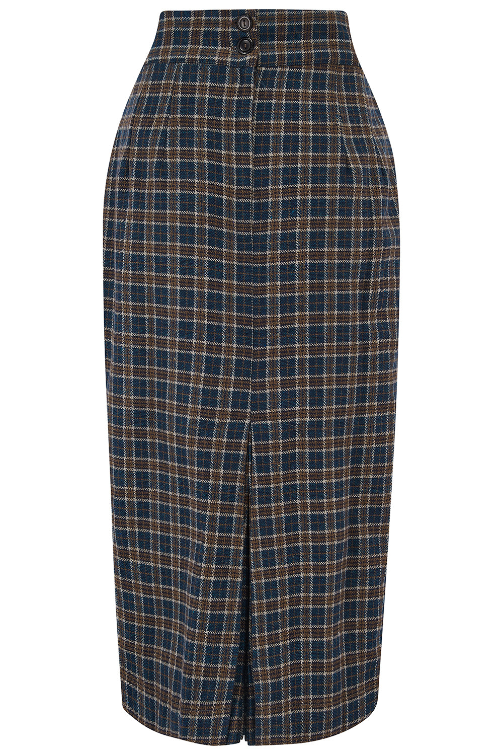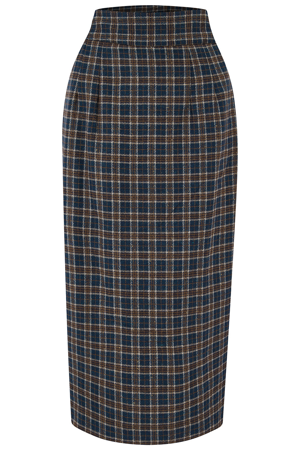 RnR "Luxe" Range "Jitterbug" Pencil Skirt with Kick-Pleat in Navy & Brown Check, 100% Wool, Iconic 1940s Vintage Style (Wool No.7)