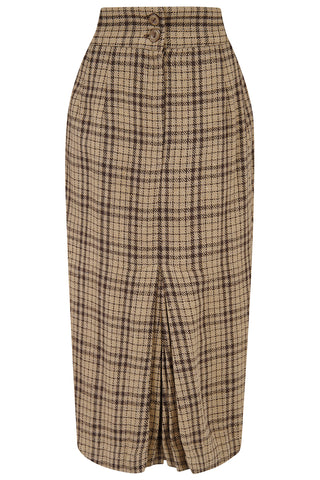 RnR "Luxe" Range "Jitterbug" Pencil Skirt with Kick-Pleat in Brown Check 100% Wool, Iconic 1940s Vintage Style (Wool No.1)
