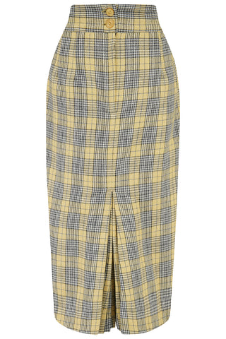 RnR "Luxe" Range "Jitterbug" Pencil Skirt with Kick-Pleat in Soft Yellow Tartan, 100% Wool, Iconic 1940s Vintage Style (Wool No.4)