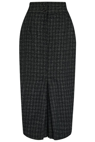 RnR "Luxe" Range "Jitterbug" Pencil Skirt with Kick-Pleat in Black Atomic Fleck Wool, Iconic 1950s Vintage Style