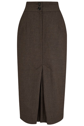 RnR "Luxe" Range "Jitterbug" Pencil Skirt with Kick-Pleat in Brown Viscose Slub Weave, Iconic 1940s Vintage Style