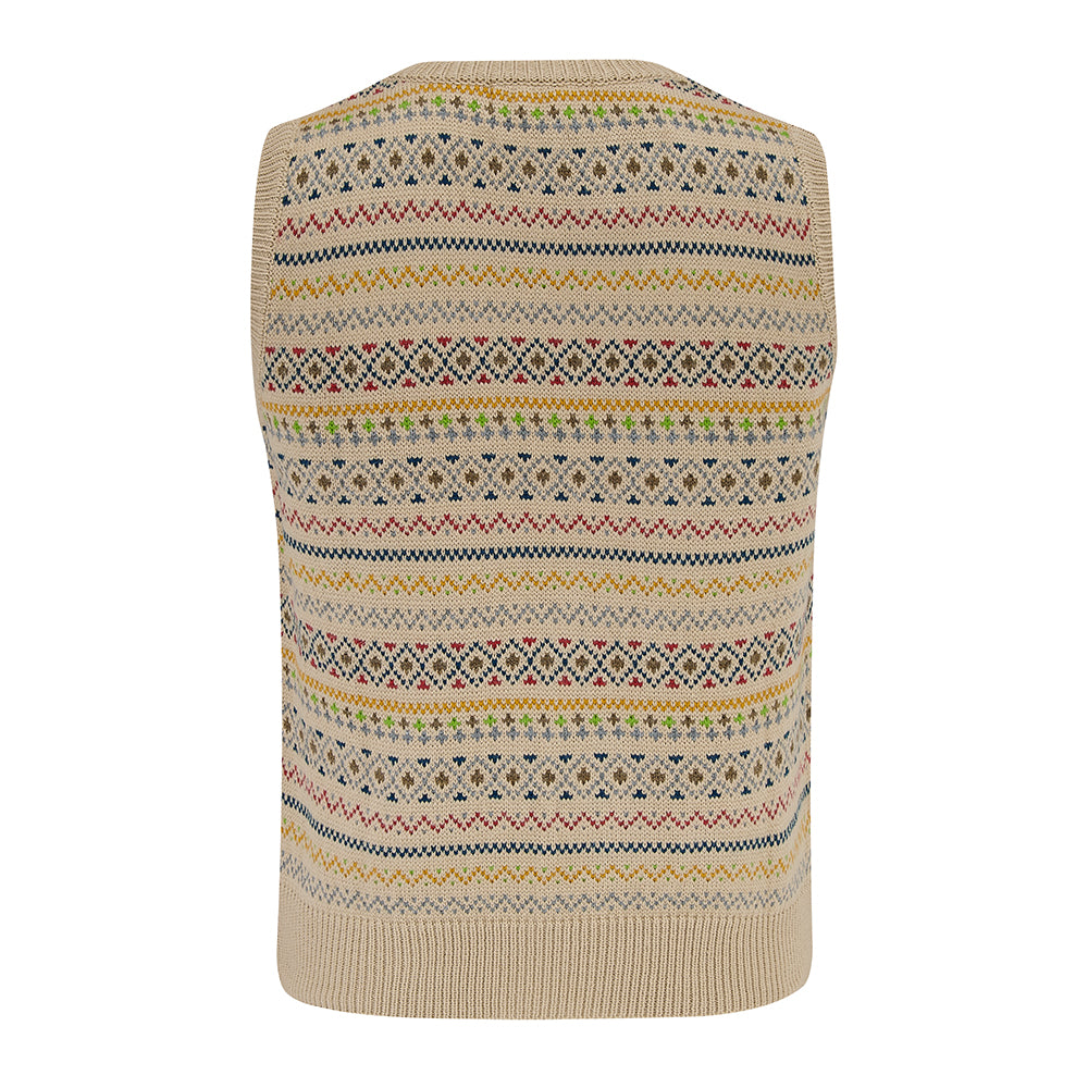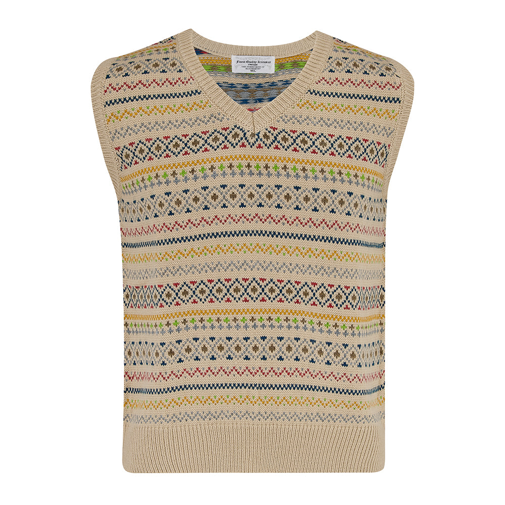 This men's knitted slipover is a classic piece inspired by true mid-century style. It features the exclusive Bloomsbury Fair Isle pattern, designed especially for The Seamstress of Bloomsbury, along with a smart V neckline and a sleeveless shape that works beautifully through the year. The carefully chosen tones make it easy to pair with high-waist men's trousers from the 1940s or 1950s range for an authentic look.
