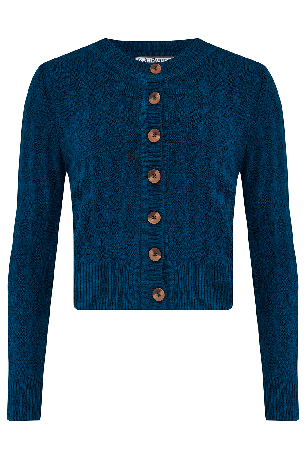 The "Sandra" Textured Diamond Knit Cardigan in Peacock Blue, 1940s & 50s Vintage Style