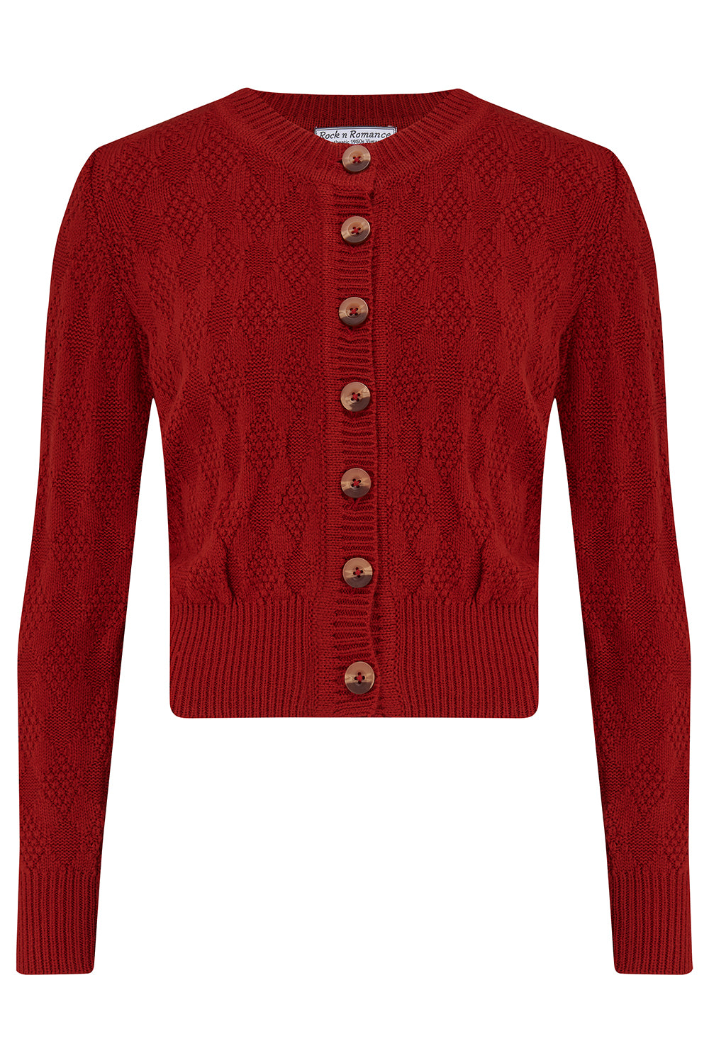 The "Sandra" Textured Diamond Knit Cardigan in Cherry Red, 1940s & 50s Vintage Style