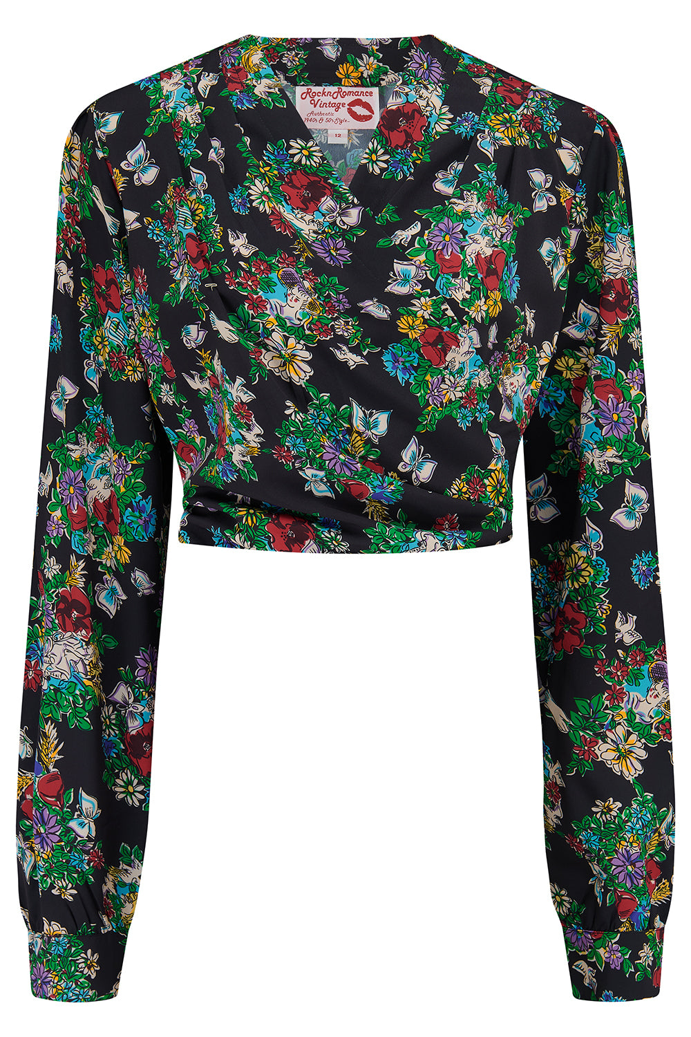 The "Darla" Long Sleeve Wrap Blouse in Secret Garden Print, True Vintage Style
