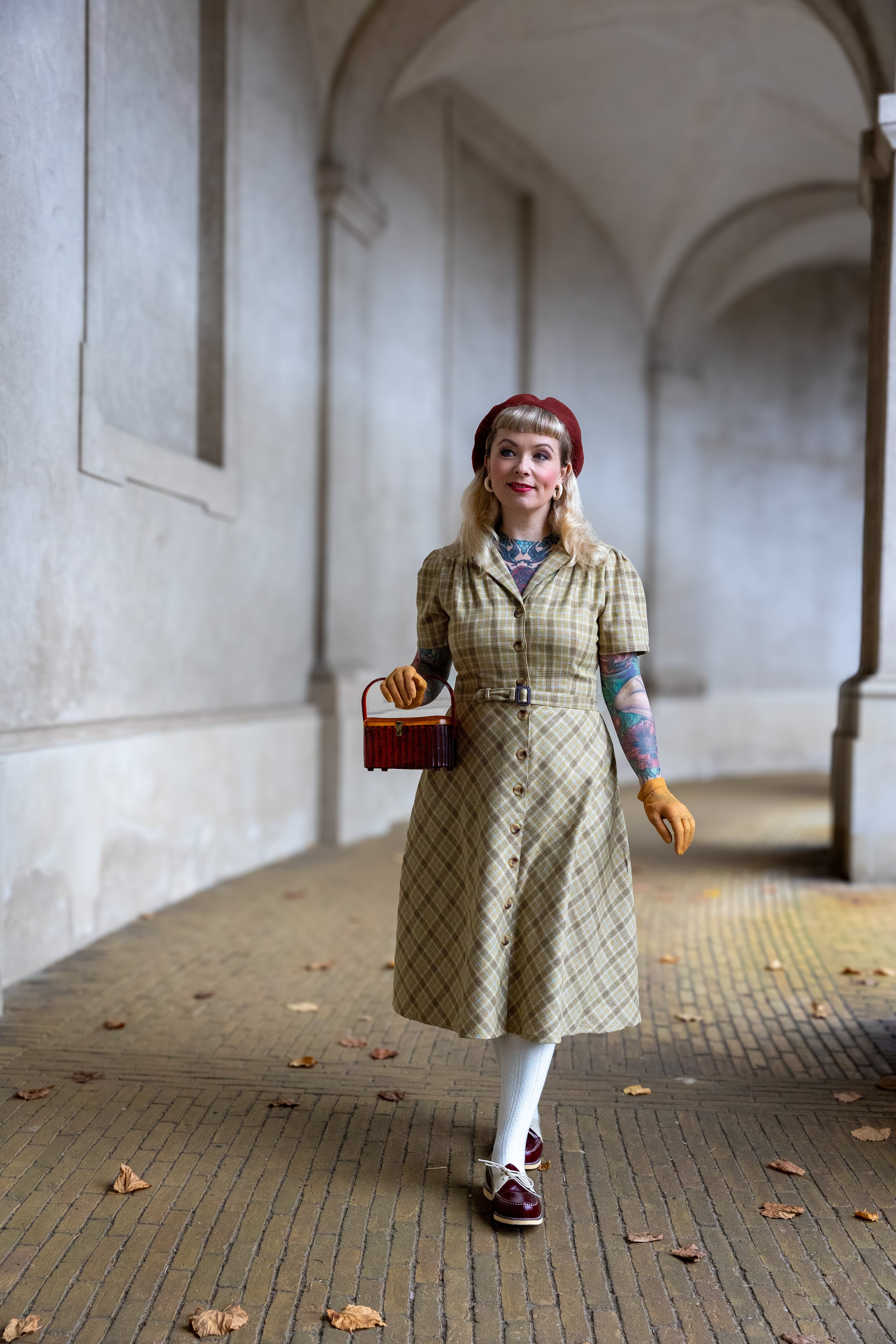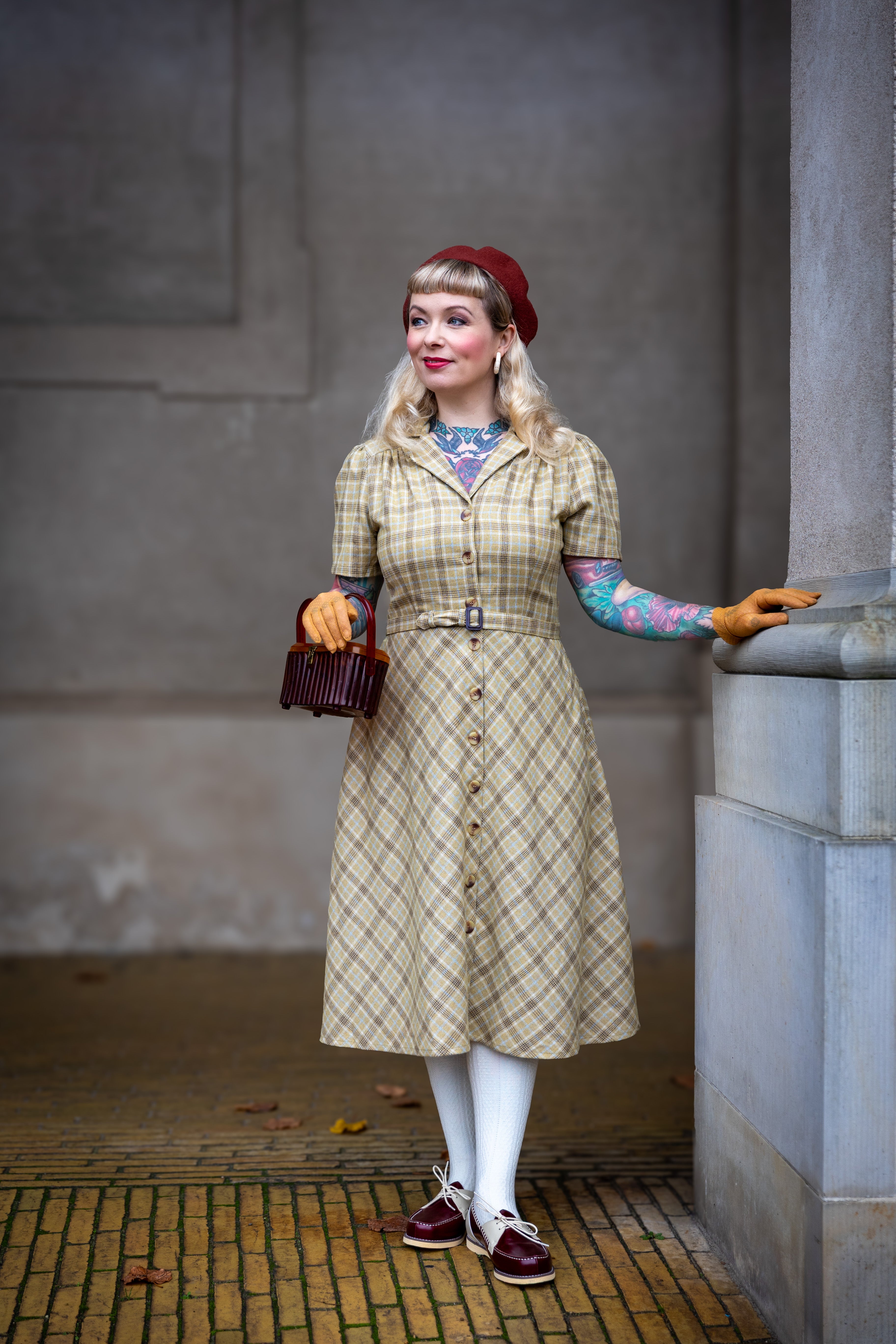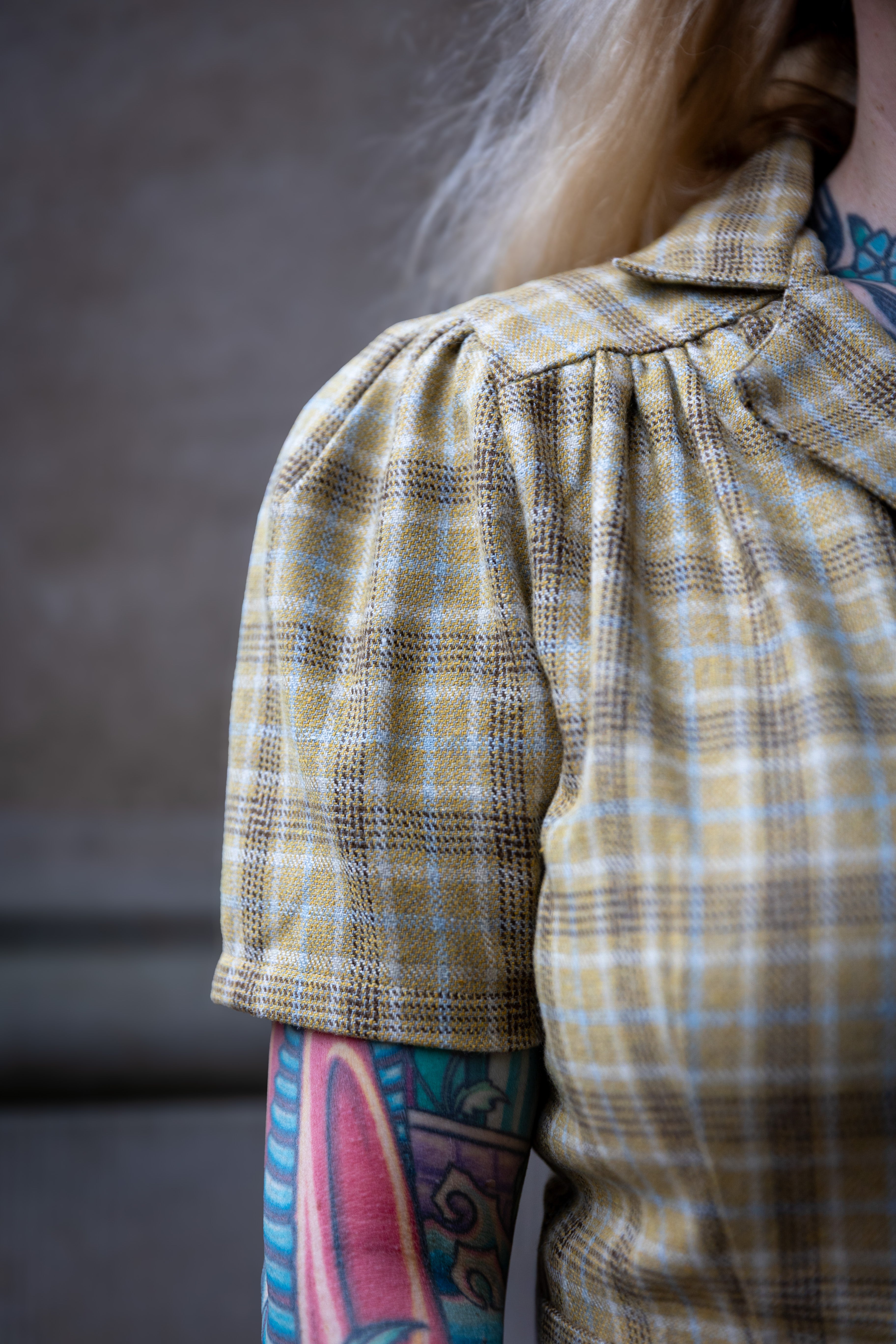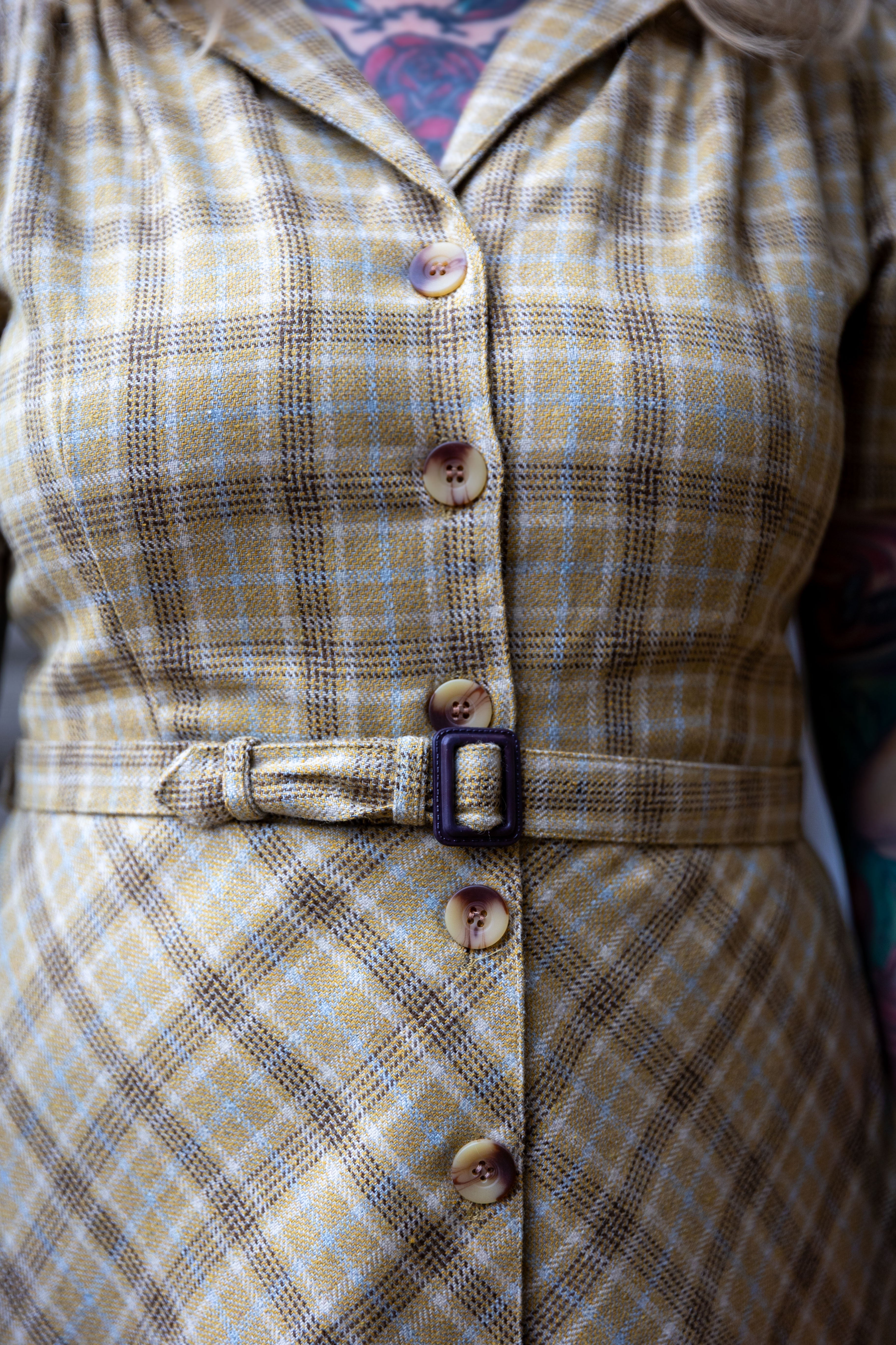 RnR "Luxe" Range, Charlene Shirtwaister Dress in Light Mustard Check 100% Wool, True 1950s Vintage Style (Wool No.3)