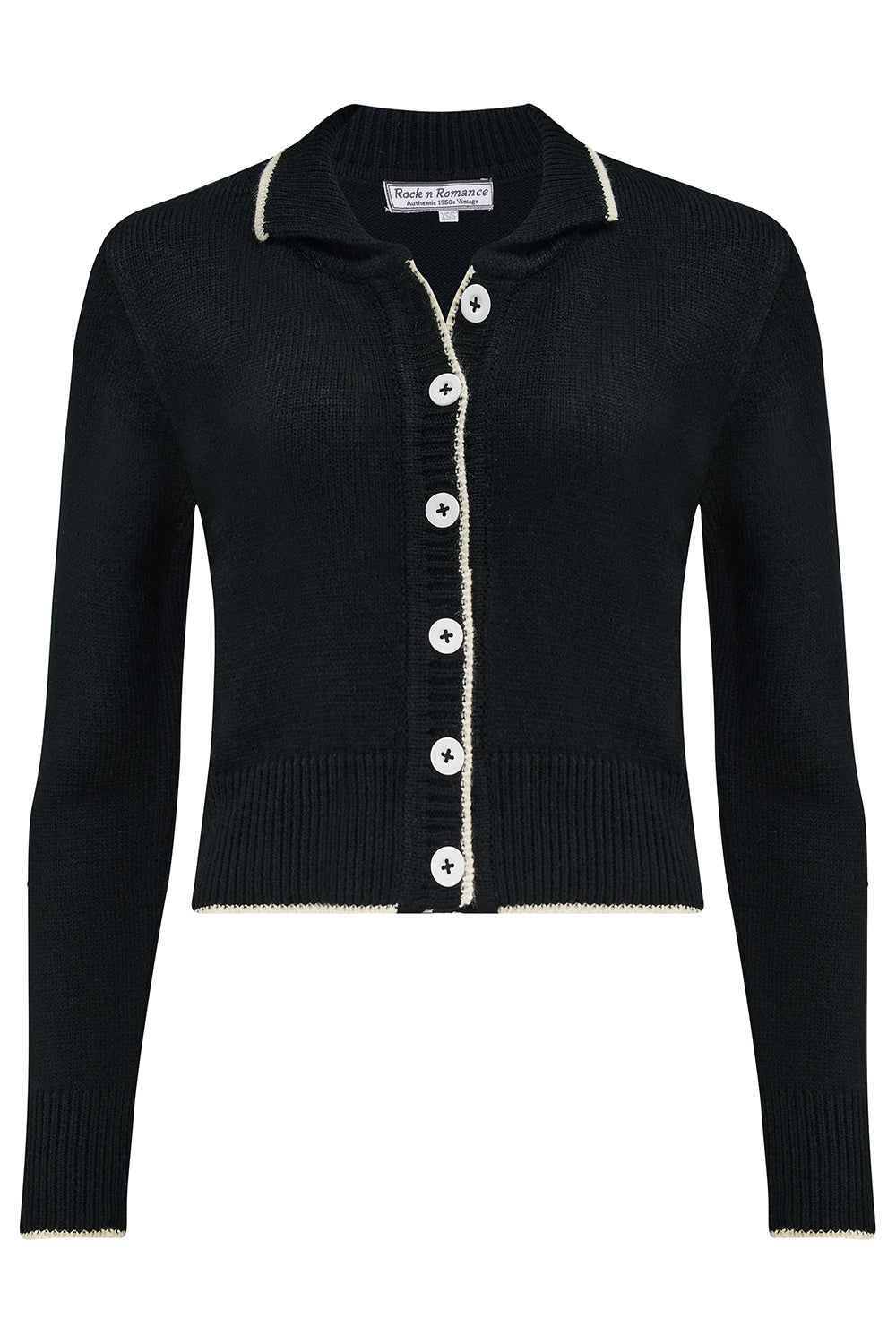 A classic & easy to wear little collared cardigan with contrast details, can be paired easily with any casual 1940s or 50s look.. Totally at home with a pair of comfy jeans and a pair of flats for a really relaxed style.. This versatile little number will be your "go to" item all year.. Made with quality yarns just like the originals, this great little item is just perfect for daytime wear or evening, work or play .. it lends itself to styles such as 1940s, 1950s Rock n Roll, Pin Up, Rockabilly ... It is simply a must have item xx