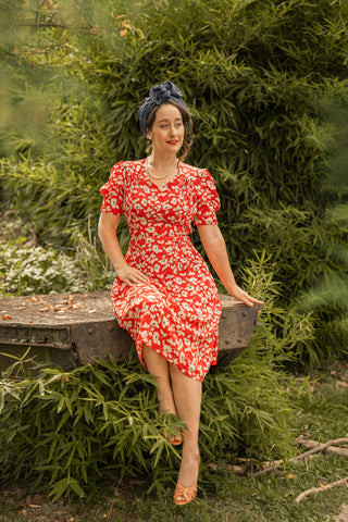 "Mabel" 3/4 Length Sleeve Waterfall Dress in Red Pansy, A Classic 1940s Inspired Vintage Style (Copy)