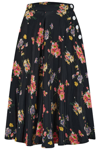 Der „Beverly“-Kreisrock mit Knopfleiste vorne und Taschen im schwarzen Whisp-Print, echter Vintage-Stil der 1950er Jahre