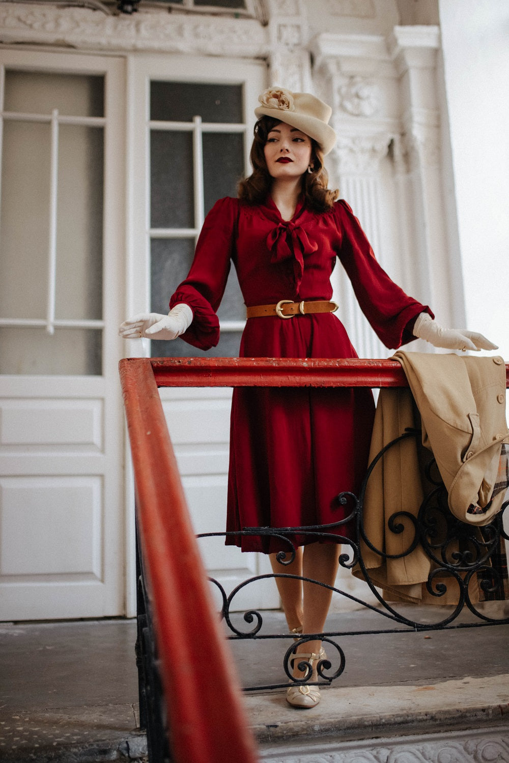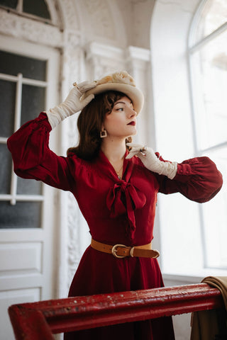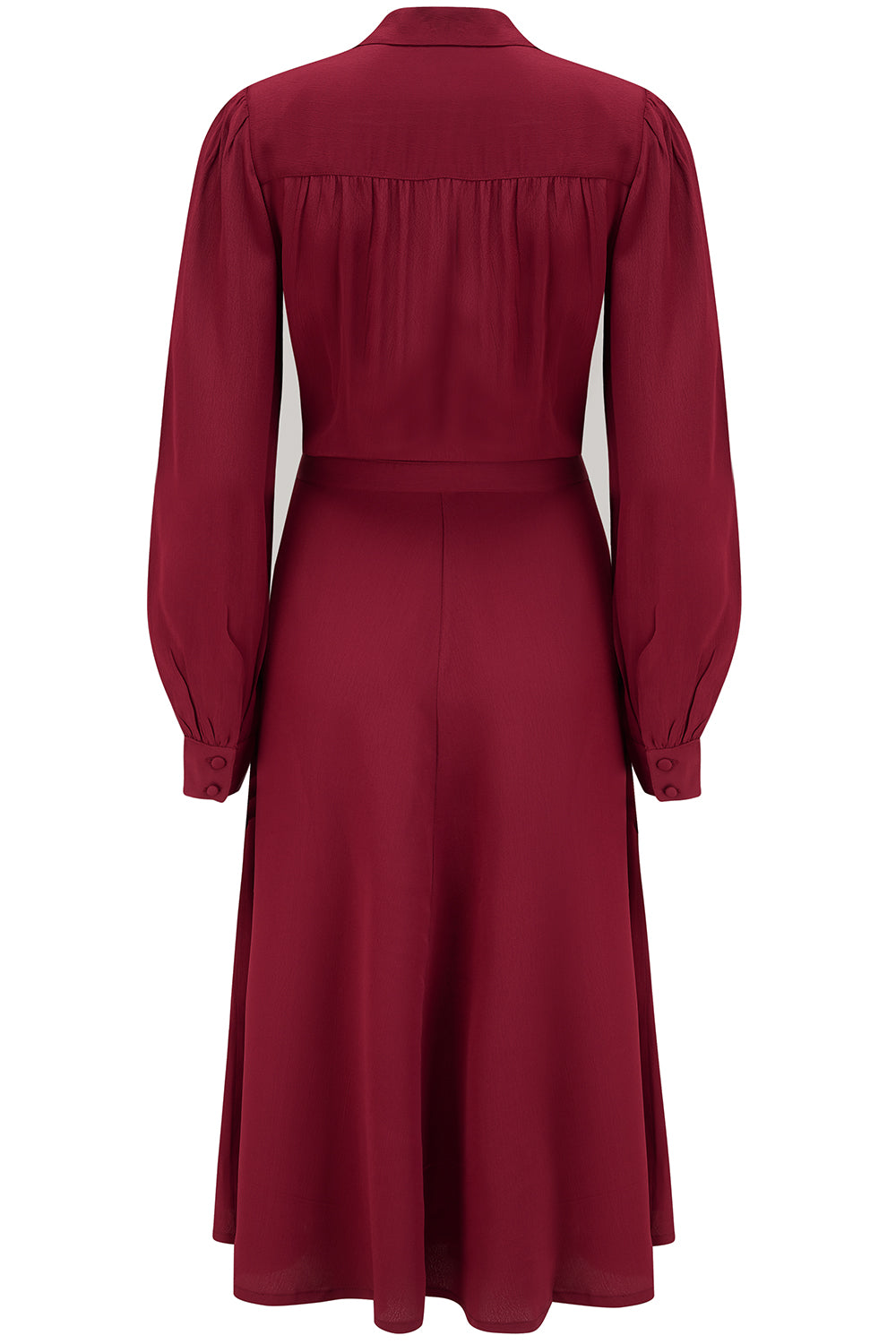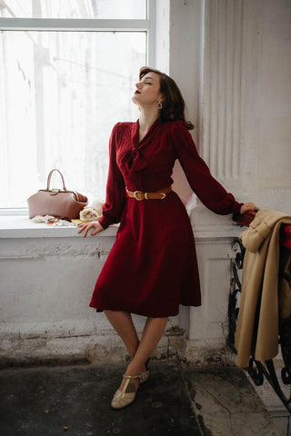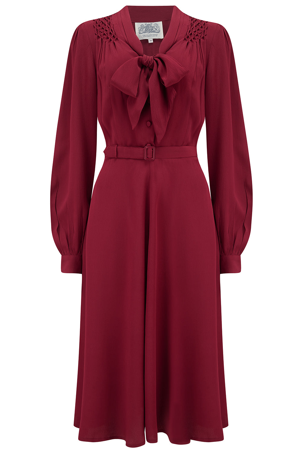 "Eva" Dress in Solid Wine , Classic 1940's Style Long Sleeve Dress with Tie Neck