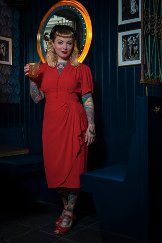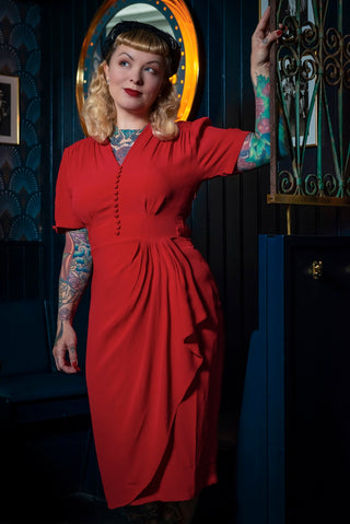 "Mabel" Waterfall Dress in Lipstick Red, A Classic 1940s Inspired Vintage Style
