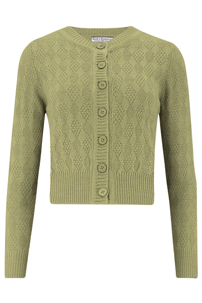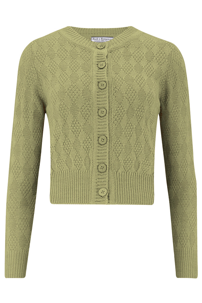 The "Sandra" Textured Diamond Knit Cardigan in Sage Green, 1940s & 50s Vintage Style