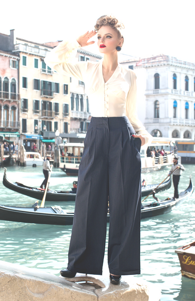 These Fabulous wide leg , high waist trousers, are a direct copy from the fit on an original 40's pair, for complete authenticity .... These will have you feeling Hollywood Glam wherever and wherever you wear them ..  fitting in all the right places oh and pockets ..! Perfect for work or play.. Simply stunning Classic 1940s Vintage Style at its best .. We just love them xx