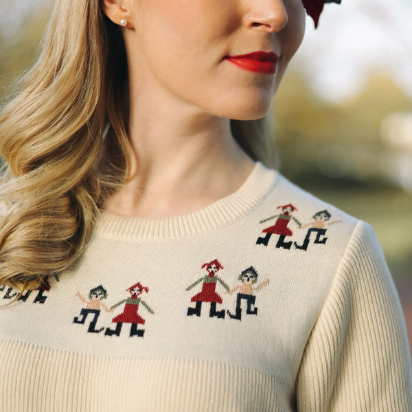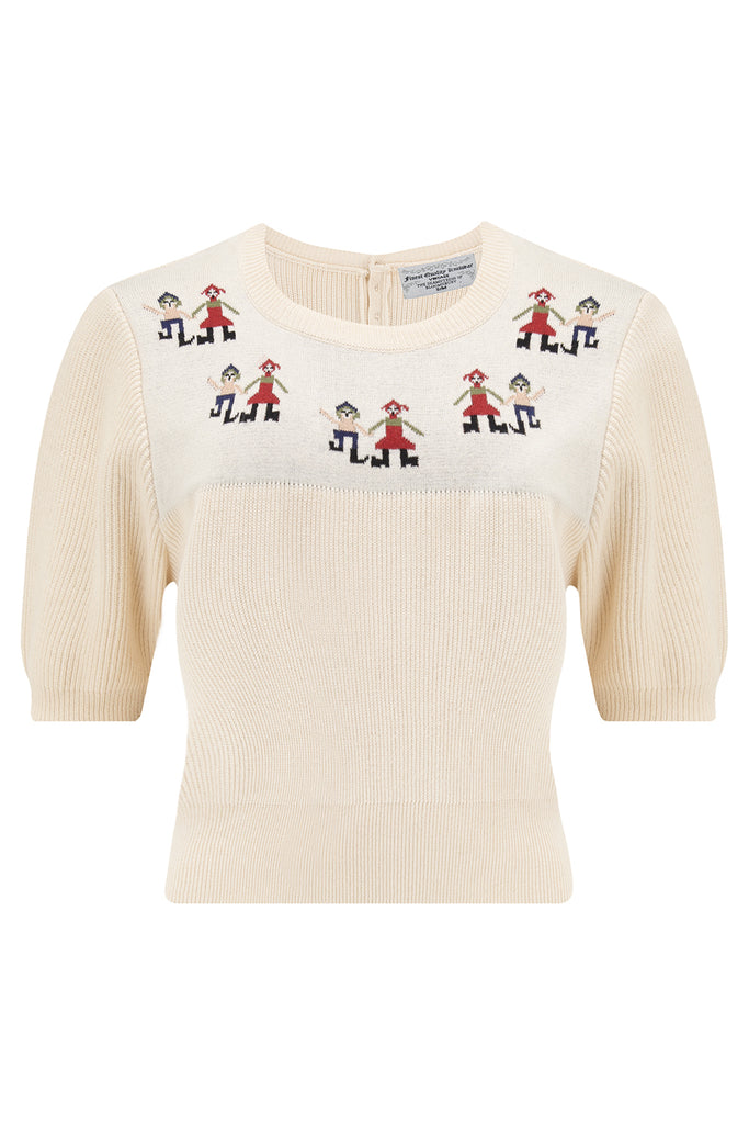 brand new 100% Cotton Beverley jumper is inspired by an original 1940s design. The figure colours are made to match the basic solid colours in our existing collection so perfect for mixing and matching with other Seamstress of Bloomsbury garments.