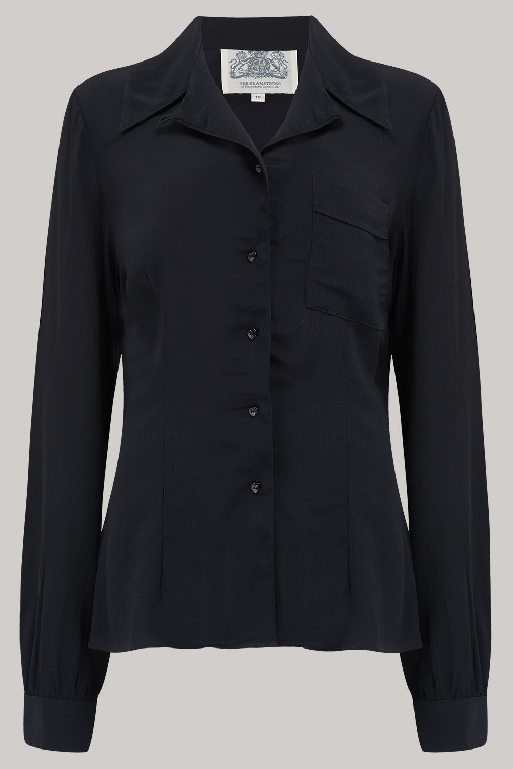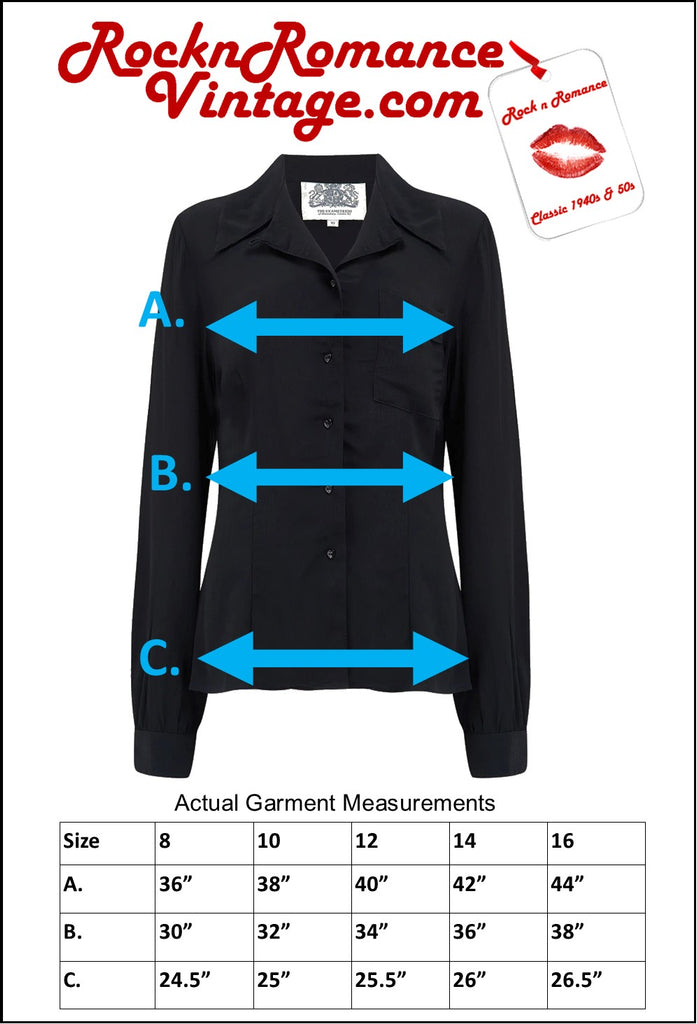 The Jacqui Blouse is a classic day blouse blouse. This one is cut to a Classic shape from the Hollywood era with a 40’s collar, pretty buttons … and long sleeves which are extra full at the cuff. The beautiful 40’s Crepe de Chine fabric is soft to the touch and easy care too! 100% natural fibre with no synthetic yarn or lycra in this garment.