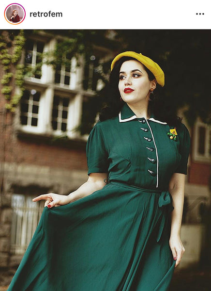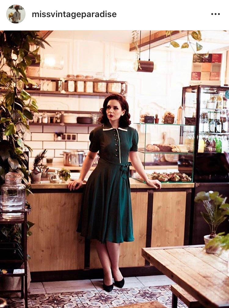 "Mae" Tea Dress in Green with Cream Contrasts, Classic 1940s Inspired Vintage Style