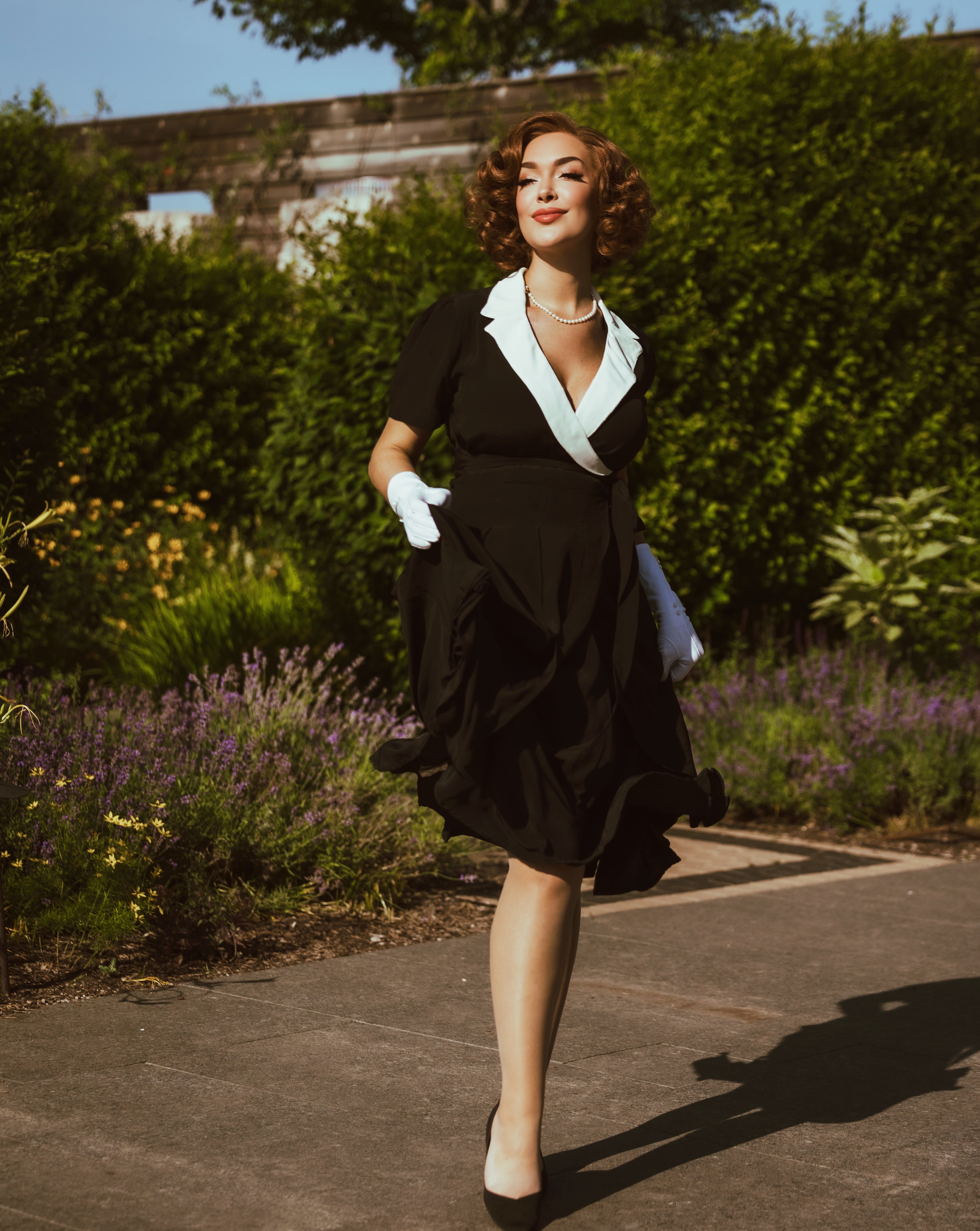 "Peggy" Wrap Dress in Black with Cream Contrast Collar, Classic 1940s Vintage Style