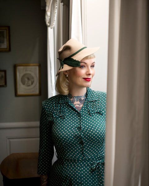 A "Seamstress of Bloomsbury" Original, Simply the best quality fabric, attention to detail and authentic Lilian Wells design. Lilian was the original "Seamstress of Bloomsbury".. She made beautiful items of clothing throughout the 1930s, 40s & Early 50s for London's aristocracy, battling the Blitz & circumstances that we cant even begin to imagine, but never compromising on her quality or delightful craftsmanship.. She was a very private but wonderful woman and an inspiration to us all. Through this wonderful range of 1940s clothing we aim to continue her legacy..