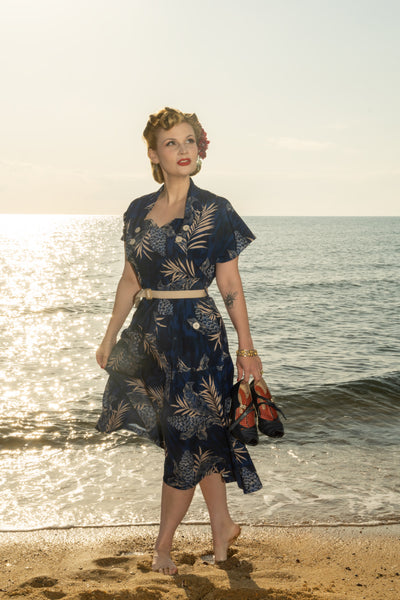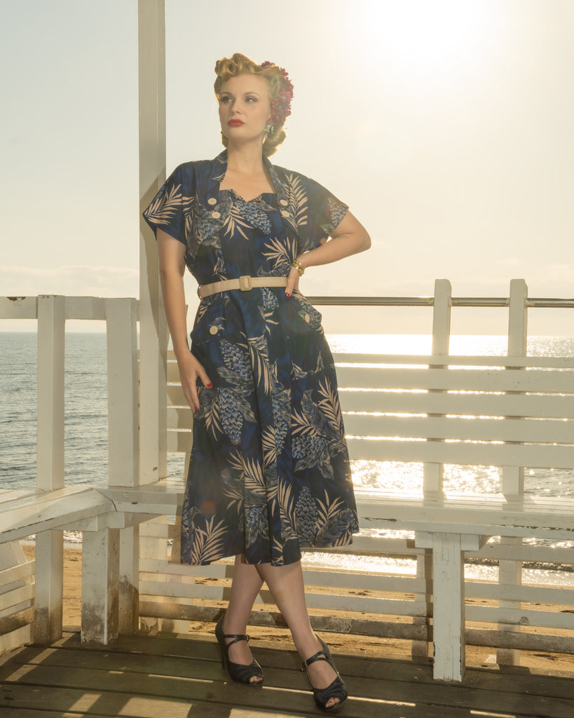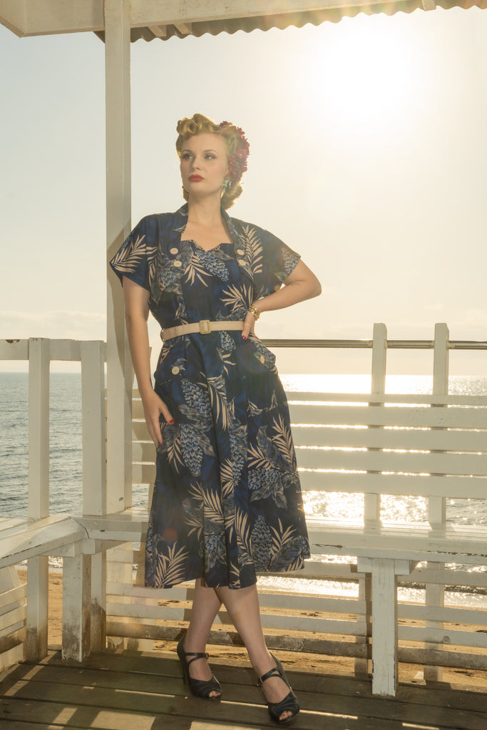 The "Ayda" 2pc Dress & Detachable Shrug Bolero Set In Sapphire Palm, True Vintage Style
