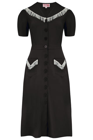 The "Dolly" Fringed Dress in Black With Ivory, Authentic 1950s Vintage Western Style