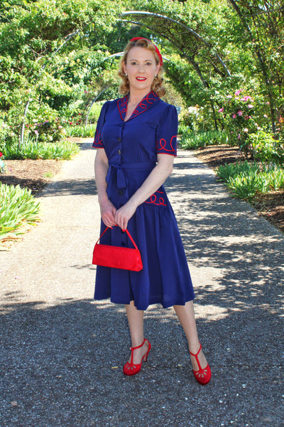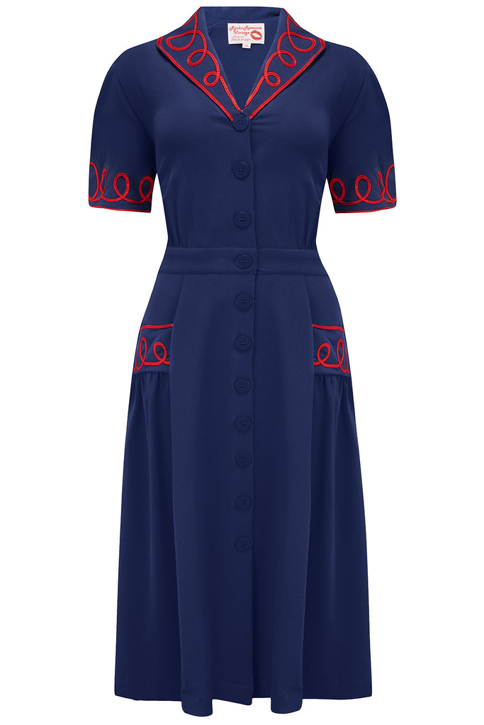The "Loopy-Lou" Shirtwaister Dress in Navy with Contrast Red RicRac, True 1950s Vintage Style
