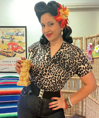 The "Darla" Short Sleeve Wrap Blouse in Leopard Print, True Vintage Style