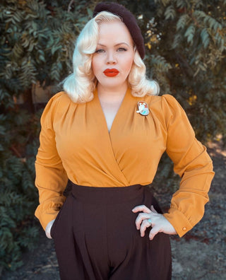 The "Darla" Long Sleeve Wrap Blouse in Mustard, True Vintage Style