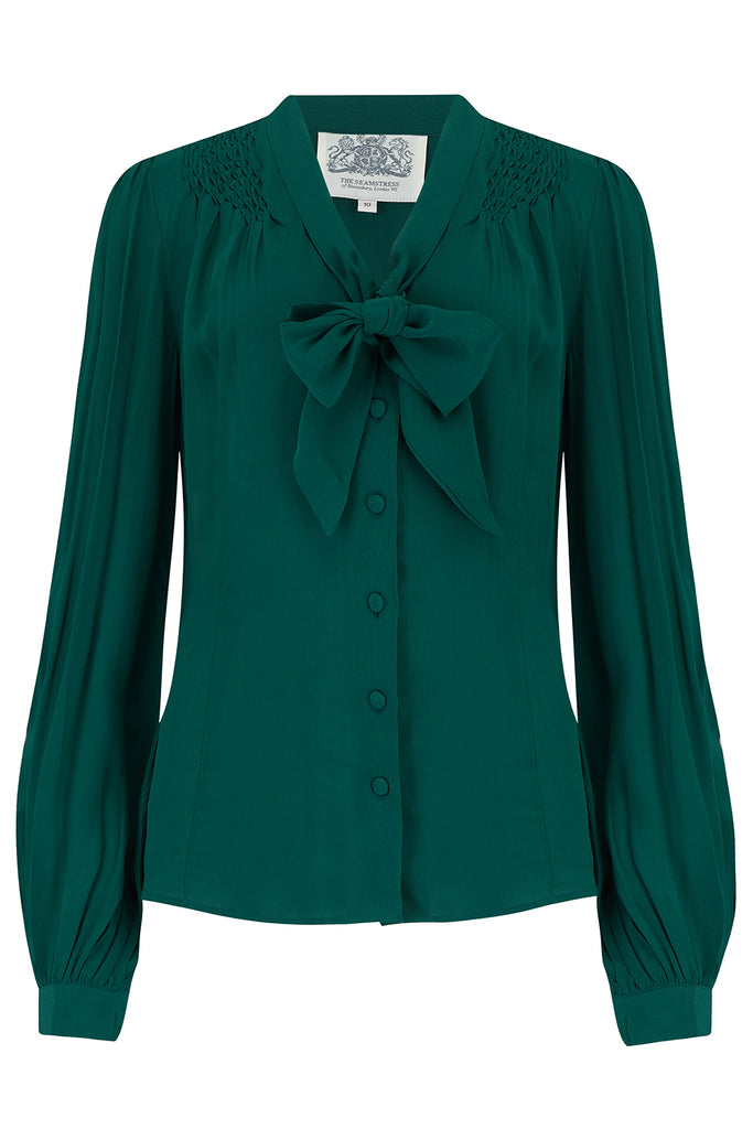 Another fabulous addition to our all time favourite blouses, this is a Classic 40’s shape with a tie bow collar, pretty smock stitching detail, little covered buttons to the front and long sleeves which are very full at the cuff.  The beautiful 40’s Crepe de Chine fabric is soft to the touch and easy care too, and is a 100% natural fibre, no synthetic yarn or Lycra in this garment, hand wash or dry clean. Also available in our slipper Atomic Satin fabric.