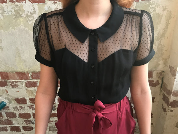 A fabulously glamorous 1940’s short sleeve blouse with cute peter pan collar, tiny heart shape buttons and yoke and sleeves in complimentary spot net. This will wonderful vintage inspired blouse makes you look and feel a million dollars every time you slip it on .. perfect for that special evening or glamorous daytime ..