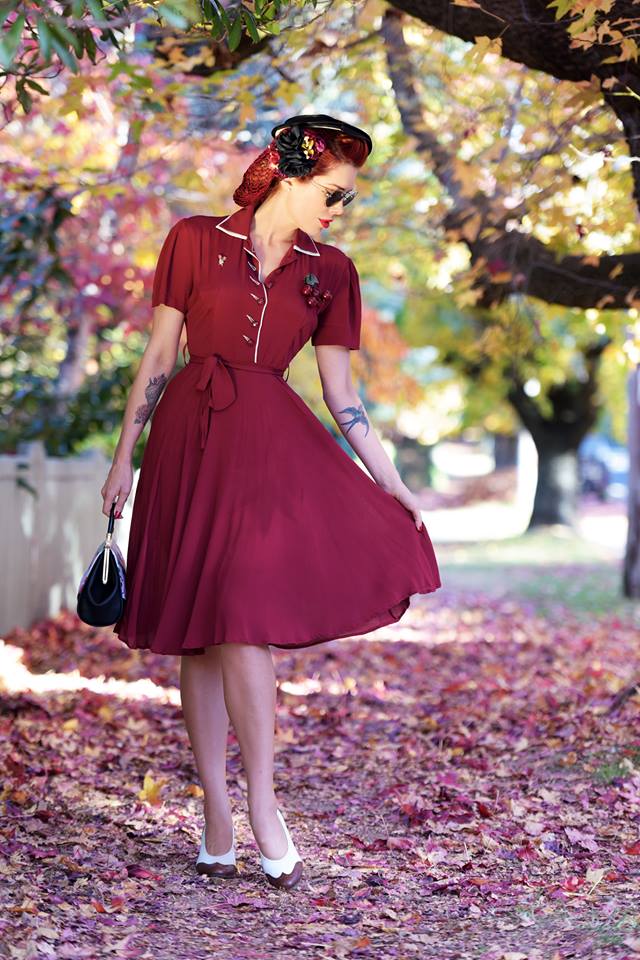 "Mae" Tea Dress in Wine with Cream Contrasts, Classic 1940s True Vintage Style
