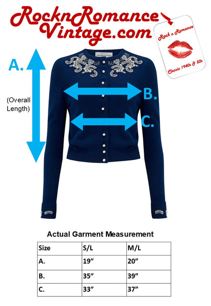 A truly sensational hand finished cardigan that can be warn easily with any casual 1940s or 50s look.. Equally at home with a pair of comfy jeans and a pair of flats for a really relaxed look.. This totally unique cardigan has stunning hand stitched beadwork, Exceptional attention to detail like the beadwork and pearlite buttons, this is a sure fire winner. Made with love & quality just like the originals, this great little item is just perfect for daytime wear or evening, work or play .. it lends itself to styles such as 1940s, 1950s Rock n Roll, Pin Up, Rockabilly ... It is simply a must have item xx