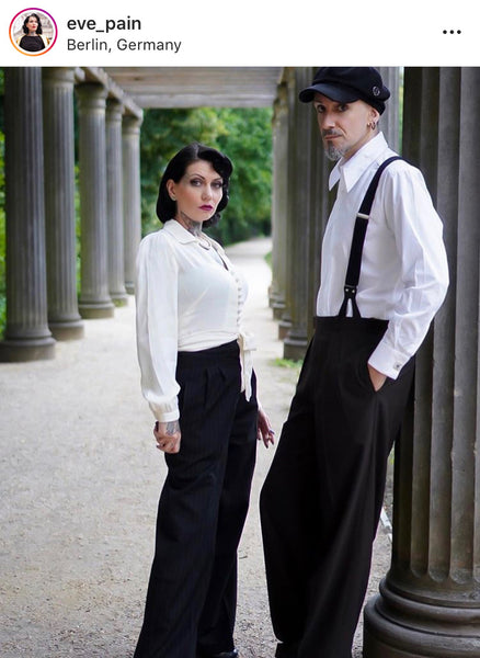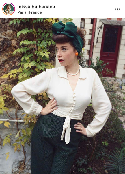 Subtle and sophisticated this slim fitted, tie waist 40s blouse is designed to flatter. The round collar leads down through an open V-neck to a row of little loop fastening dome buttons and a bow which ensures that the blouse hugs your torso and emphasises your natural waist.  The long sleeves are slightly puffed, but simple and classic rather than voluminous. This is pared back classic 40s elegance at it’s best.
