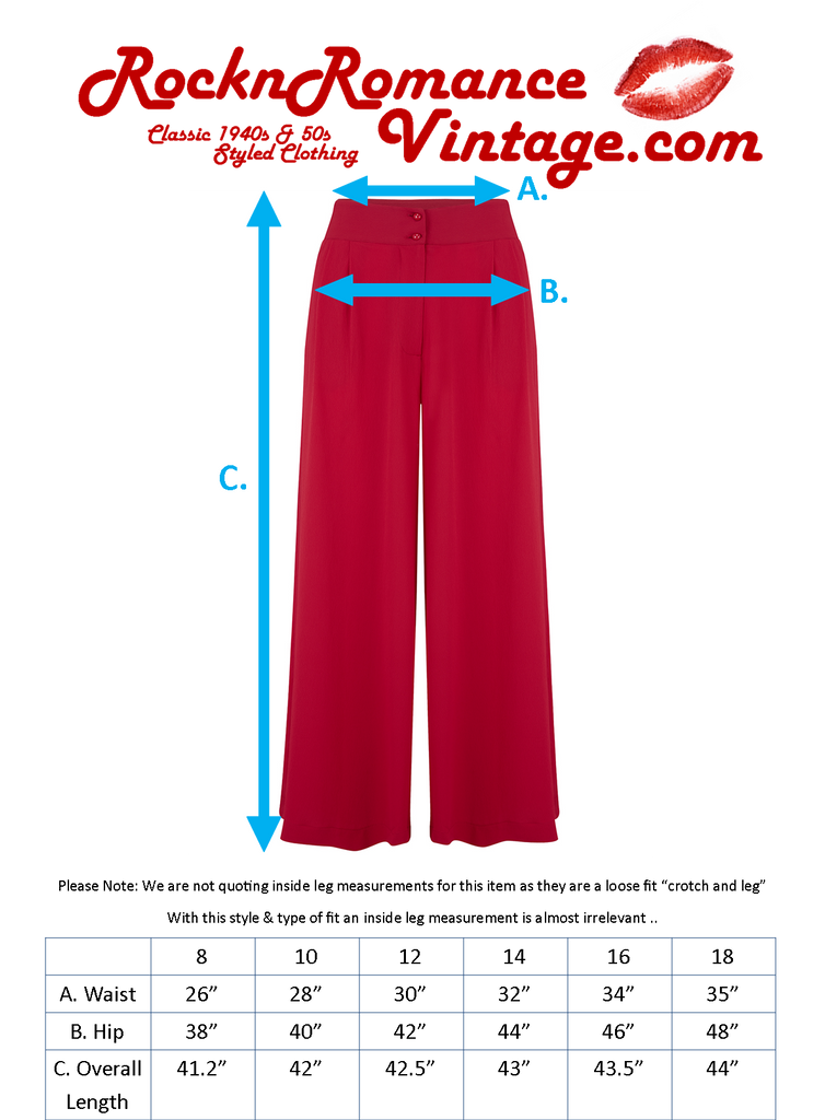 A classic in any wardrobe, Screaming that Hollywood Golden era from the late 1940s-1950s.. The high waist double front button & loose fit wide leg palazzo style legs just oozes charm. glamour & sophistication.. Easily worn with vintage style in mind,  Perfectly combined with a smart blouse for a smart/casual evening look, These are equally suitable for a classic works office look.. These are your new "do it all" go to item .. Finished with a pair of buttons and a tall waistband, oh and pockets .. yes these beauties have pockets too .. The medium weight Polly Crepe fabric hangs perfectly & is super soft to the touch.. easy care too.