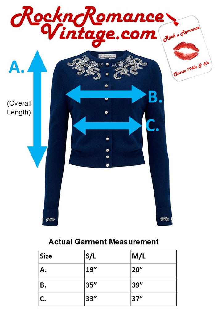 A truly sensational hand finished cardigan that can be warn easily with any casual 1940s or 50s look.. Equally at home with a pair of comfy jeans and a pair of flats for a really relaxed look.. This totally unique cardigan has stunning hand stitched beadwork, Exceptional attention to detail like the beadwork and pearlite buttons, this is a sure fire winner. Made with love & quality just like the originals, this great little item is just perfect for daytime wear or evening, work or play .. it lends itself to styles such as 1940s, 1950s Rock n Roll, Pin Up, Rockabilly ... It is simply a must have item xx