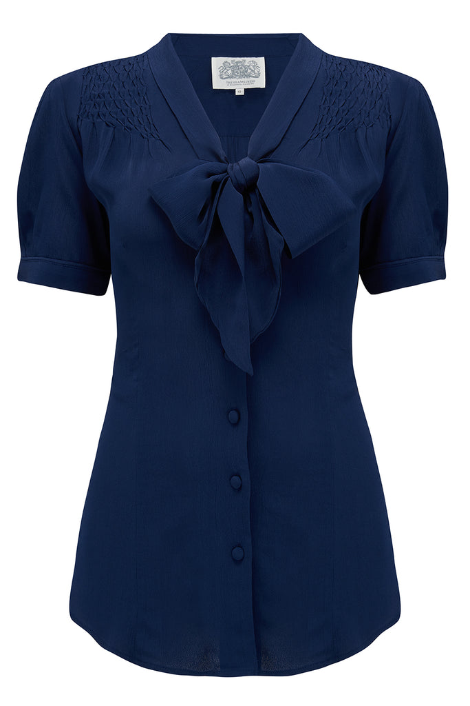 Another fabulous addition to our all time favourite blouses, this is a Classic 40’s shape with a tie bow collar, pretty smock stitching detail, little covered buttons to the front and short sleeves .  The beautiful 40’s Crepe de Chine fabric is soft to the touch and easy care too, and is a 100% natural fibre, no synthetic yarn or Lycra in this garment, hand wash or dry clean. Also available in our slipper Atomic Satin fabric.