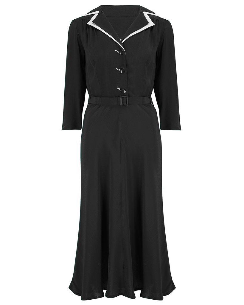 "Lisa-Mae" 3/4 Sleeve Shirt Dress in Black with Contrast Under Collar, Authentic 1940s Vintage Style at its Best