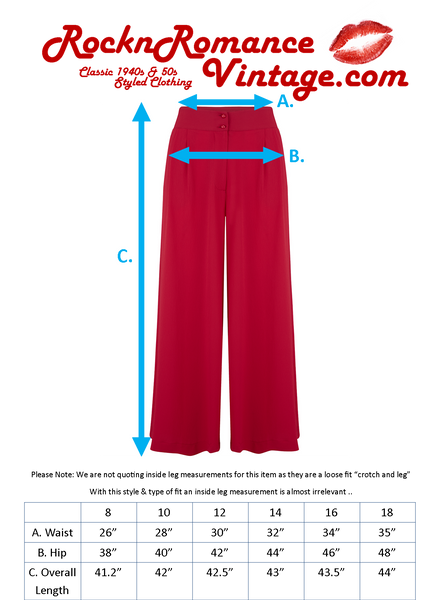 A classic in any wardrobe, Screaming that Hollywood Golden era from the late 1940s-1950s.. The high waist double front button & loose fit wide leg plazo style legs just oozes charm. glamour & sophistication.. Easily worn with vintage style in mind, Perfectly combined with a smart blouse for a smart/casual evening look, These are equally suitable for a classic works office look.. These are your new "do it all" go to item .. Finished with a pair of buttons and a tall waistband, oh and pockets .. yes these beauties have pockets too .. The medium weight Polly Crepe fabric hangs perfectly & is super soft to the touch.. easy care too.