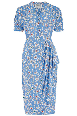 "Mabel" Waterfall Dress in Palace Blue Pansy Print, A Classic 1940s Inspired Vintage Style By The Seamstress of Bloomsbury