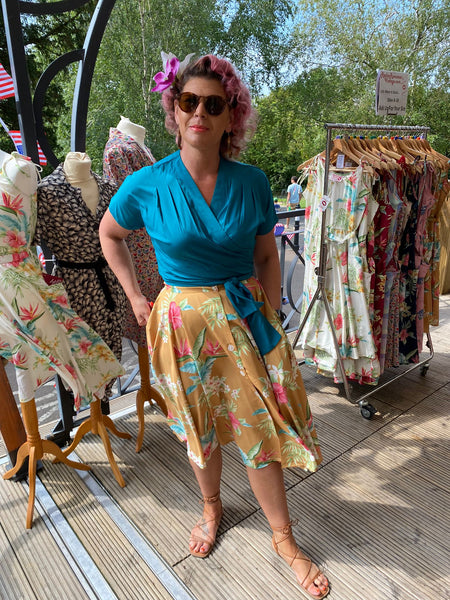 A beautiful 1950s Full Circle Skirt with full buttoned front & neat inseam pockets.. The beautiful wooden buttons give that extra special Tiki feel, It has oodles of fabric that hangs luxuriously & swings out beautifully into a full circle when you twist & swirl. The Polly Crepe fabric hangs beautifully & is super soft to the touch and easy care too.