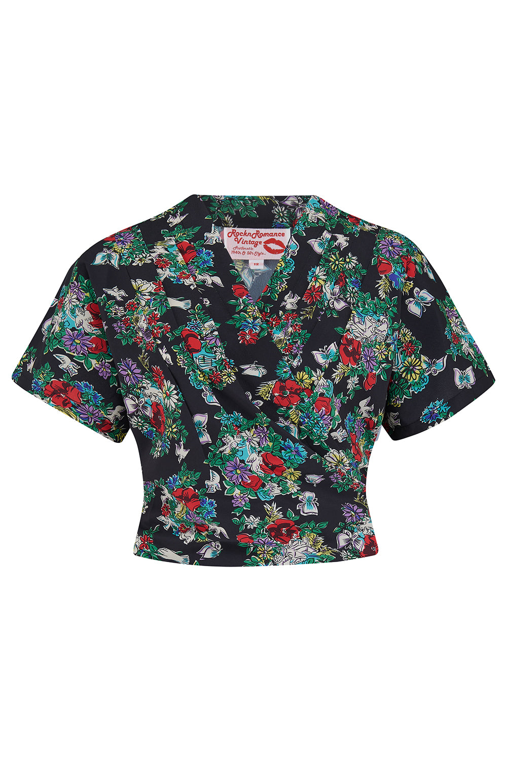 The "Darla" Short Sleeve Wrap Blouse in Secret Garden Print, True Late 1940s Vintage Style