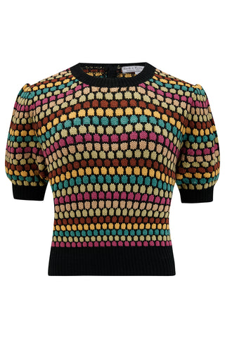 The "Claudette" Short Sleeve Pullover Jumper in Black With Multi Colour Spots, Classic 1940s & 50s Vintage Style