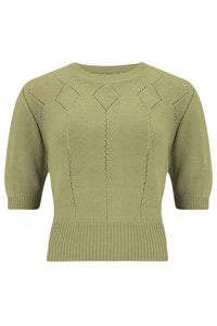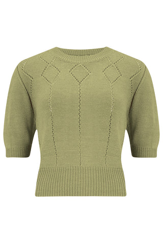 The "Vera" Short Sleeve Pullover Jumper in Sage Green, Classic 1940s & 50s Vintage Style