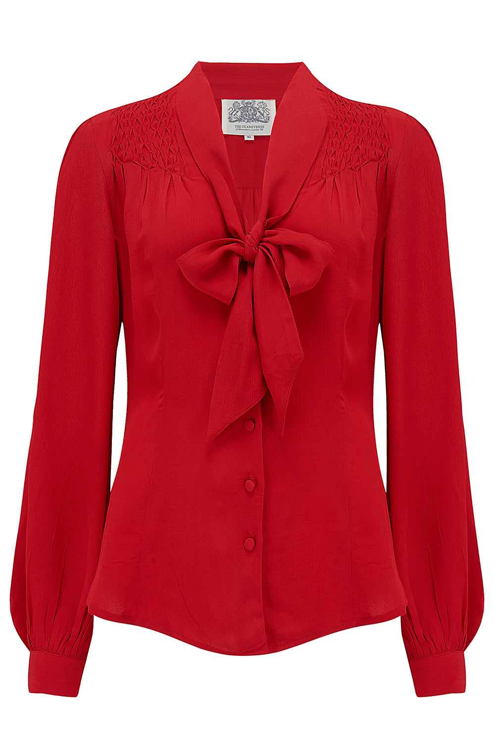 Un autre ajout fabuleux à nos chemisiers préférés de tous les temps, il s'agit d'une forme classique des années 40 avec un col à nœud papillon, de jolis détails de coutures smockées, de petits boutons recouverts sur le devant et des manches longues très amples au niveau des poignets. Le magnifique tissu Crêpe de Chine des années 40 est doux au toucher et facile d'entretien. Il s'agit d'une fibre 100 % naturelle, sans fil synthétique ni Lycra dans ce vêtement, lavable à la main ou à sec. Également disponible dans notre tissu chausson Atomic Satin.