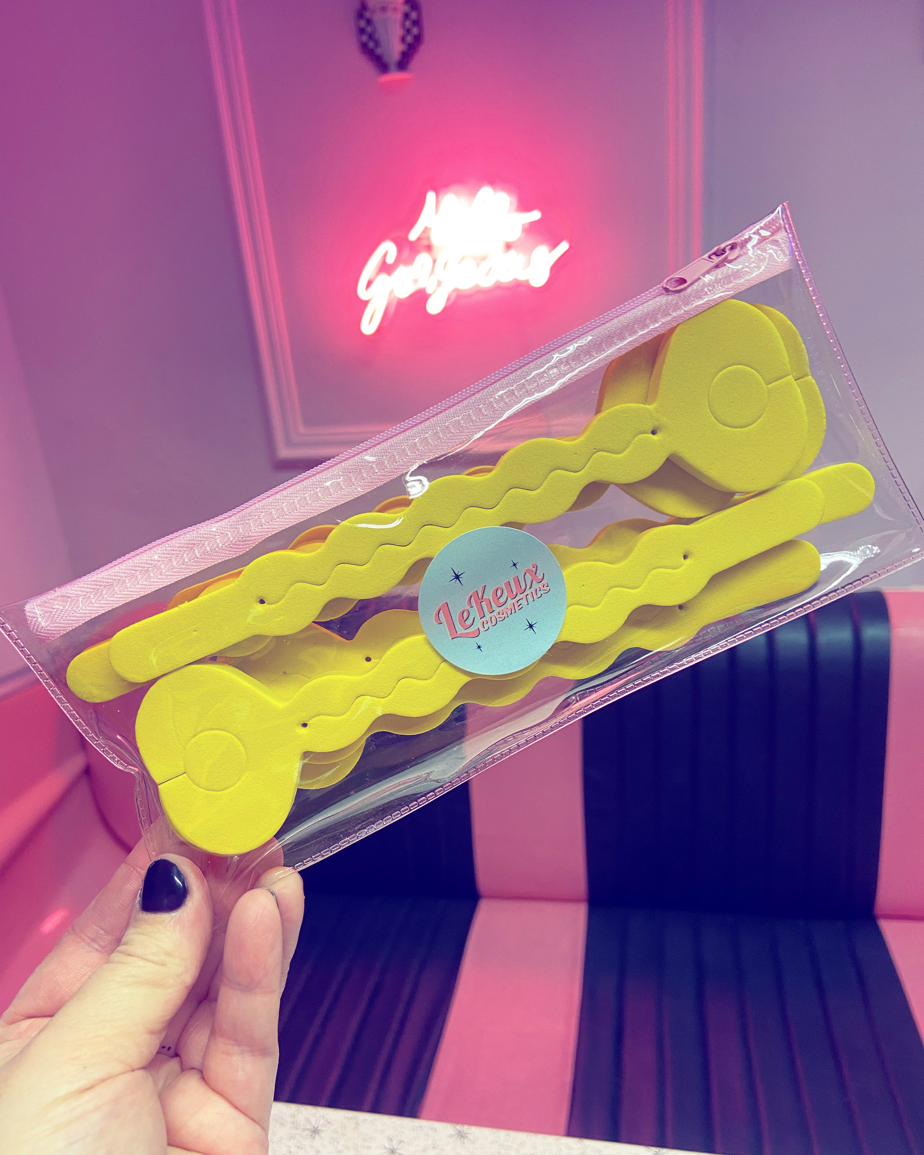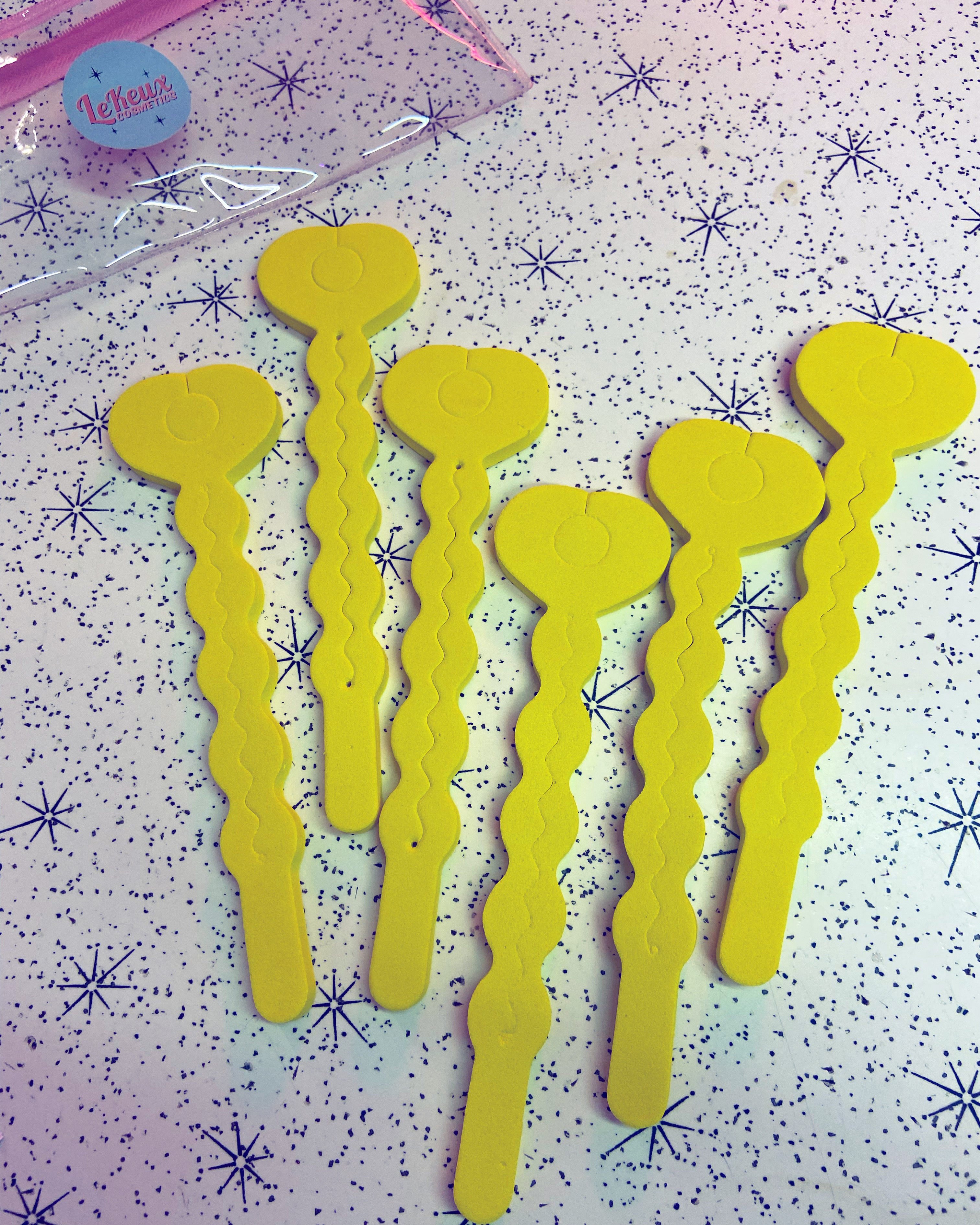 These super simple to use foam Yellow curlers are ideal for a wet set. Very light to wear and self fascinating. Simply twist damp hair (with setting lotion if preferred) around the centre of the rod then fasten by putting the end of the rod through the hole in the heart at the other end.