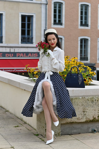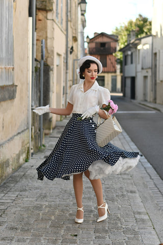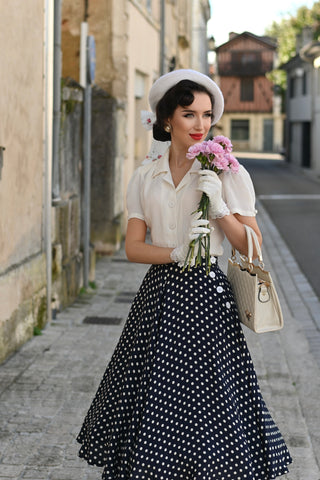 Jupe "Isabelle" en bleu marine à pois blancs, style classique et authentique d'inspiration vintage des années 1940