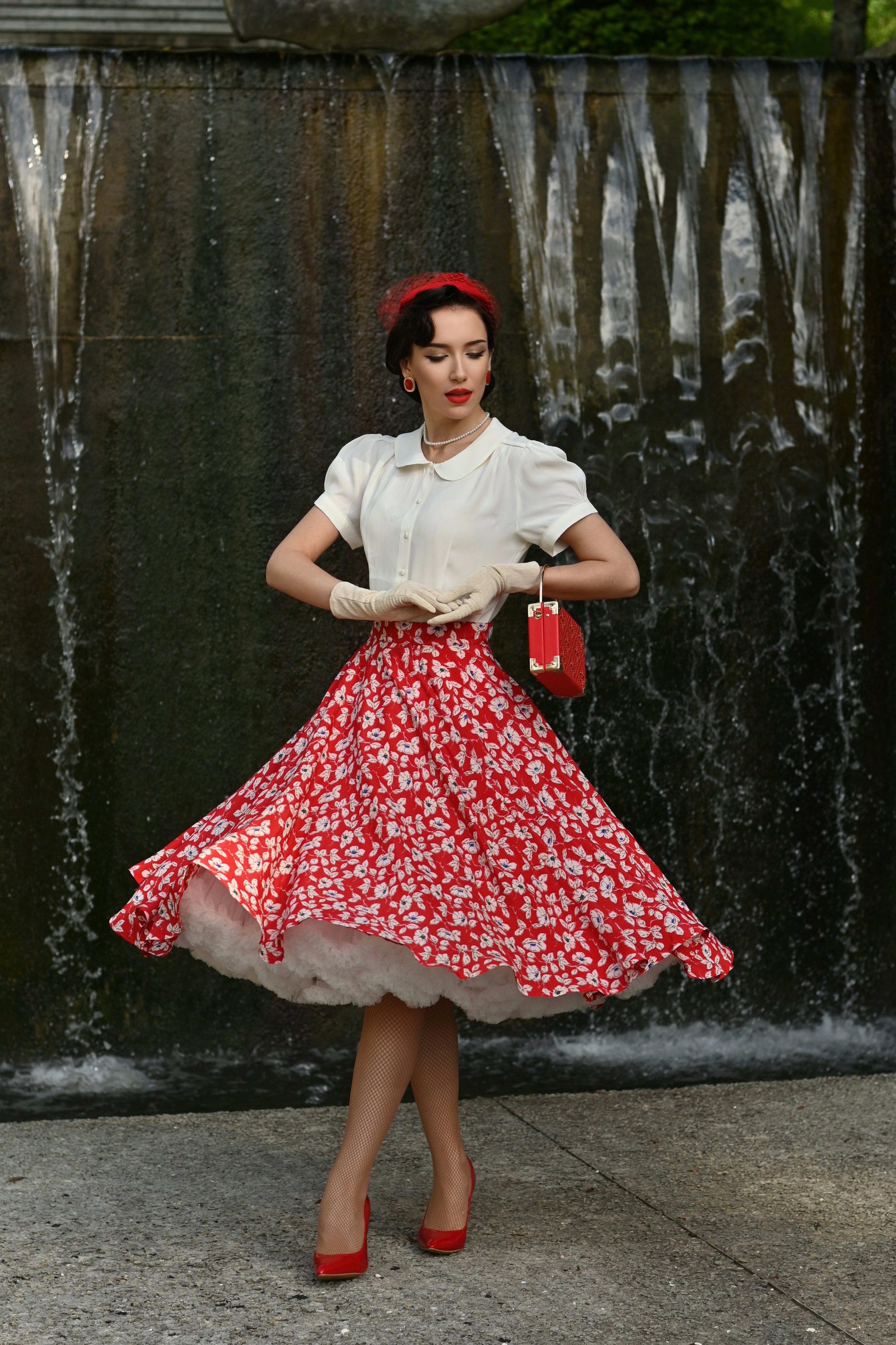 "Isabelle" Skirt in Red Pansy Print, Classic & Authentic 1940s Vintage Inspired Style